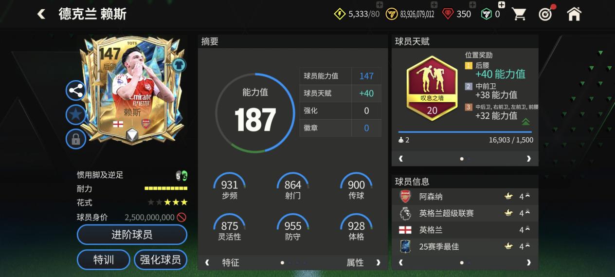 实战表现:在 4231 边路阵型的后腰位置上,赖斯的赛场表现堪称卓越,是球队防守体系的坚实支柱。