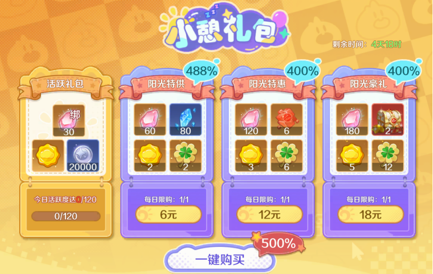 活动规则:活动期间,只需每日活跃达到120点,或选择直接花费6元、12元、18元即可购买超值特惠礼包。更棒的是,选择“一键购买”还可享受8折优惠!奖励次数将于跨天凌晨5点刷新,切勿错过。活动范围:开服第八天开启。