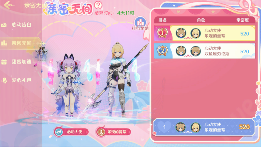 活动规则:心动为证,甜蜜成诗!情人节活动期间,与TA共筑的每点亲密度都将折算为「心动天梯」积分;按累计亲密值进行排行,排名前三的情侣/搭档组合,将解锁情人节限定环身特效奖励。