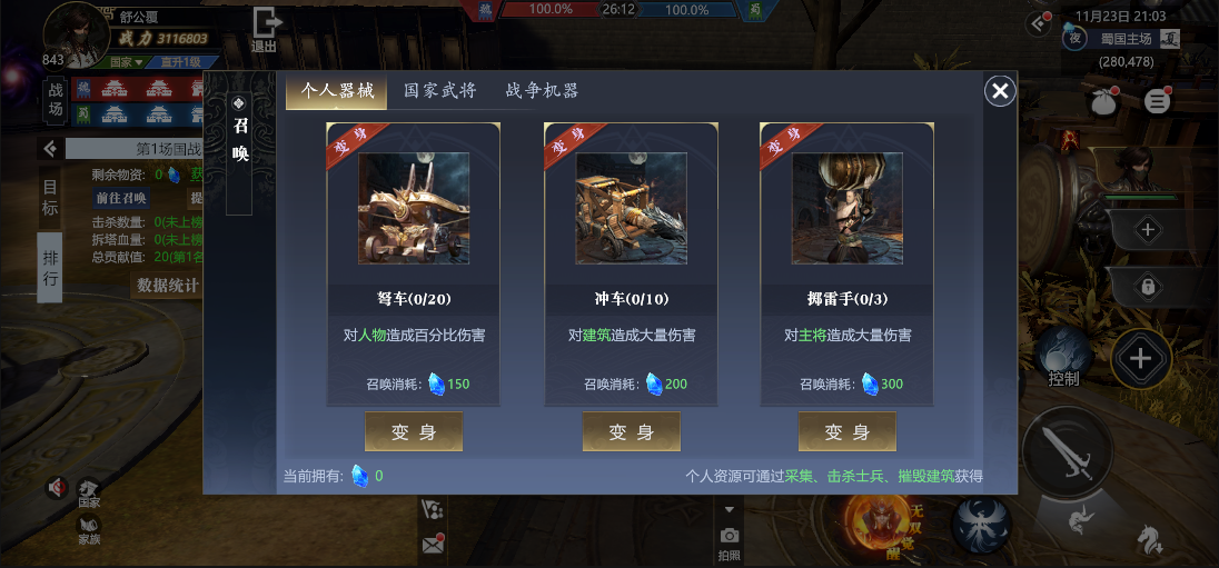 (tips:战力高的玩家可以通过攻击建筑、击杀士兵来快速增加个人资源,战力低的玩家建议先通过采集来获得个人资源;获得资源后尽快换取冲车来对据点进行攻击,注意玩家幻化的冲车会被敌人击杀,所以需要注意躲避敌人,建议幻化后跟随队友同行;之后再根据战场局势变化来召唤国家武将和战争机器即可)