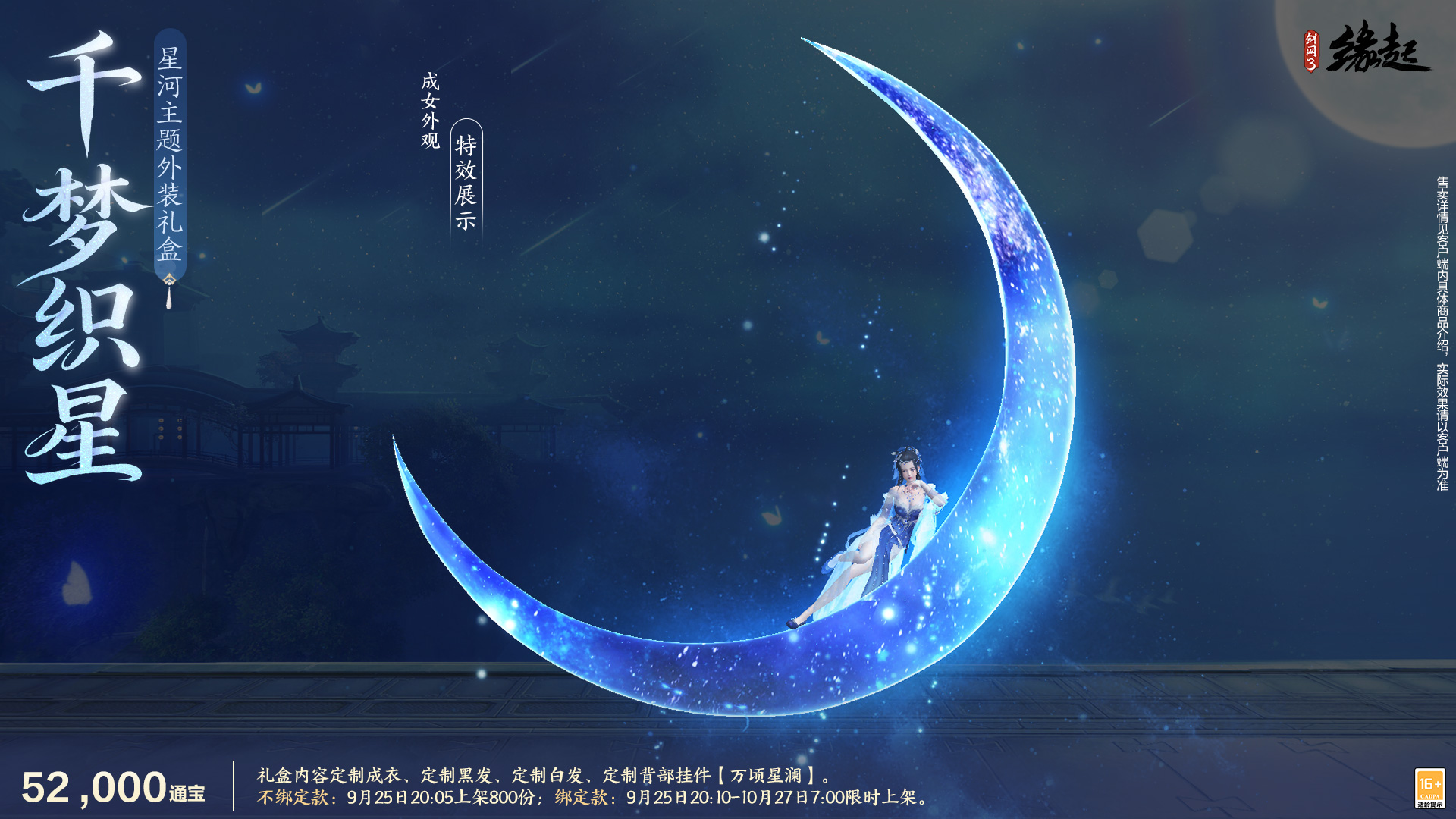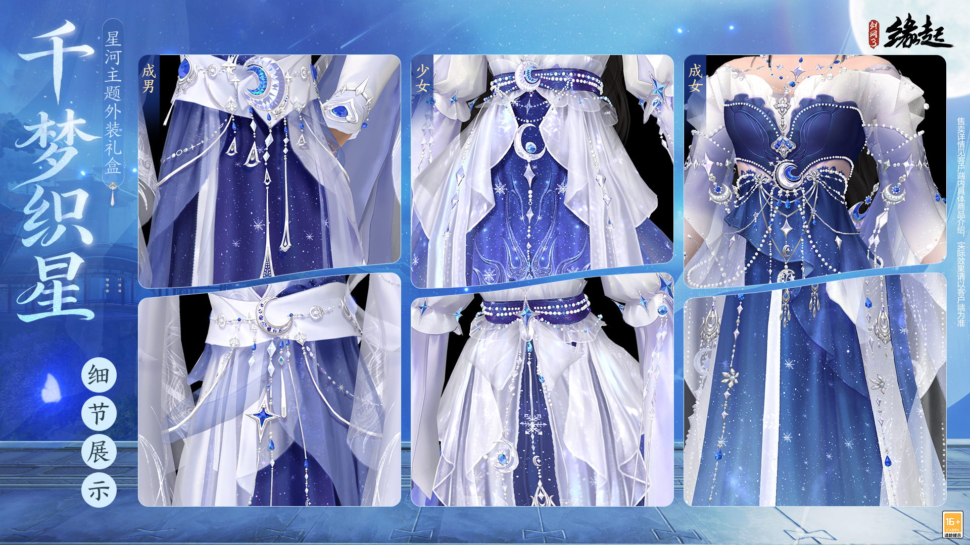 引月华作线,裁星河为绢,织入三千琉璃梦。《剑网3缘起》原创星河主题外装礼盒「千梦织星」踏月而来。