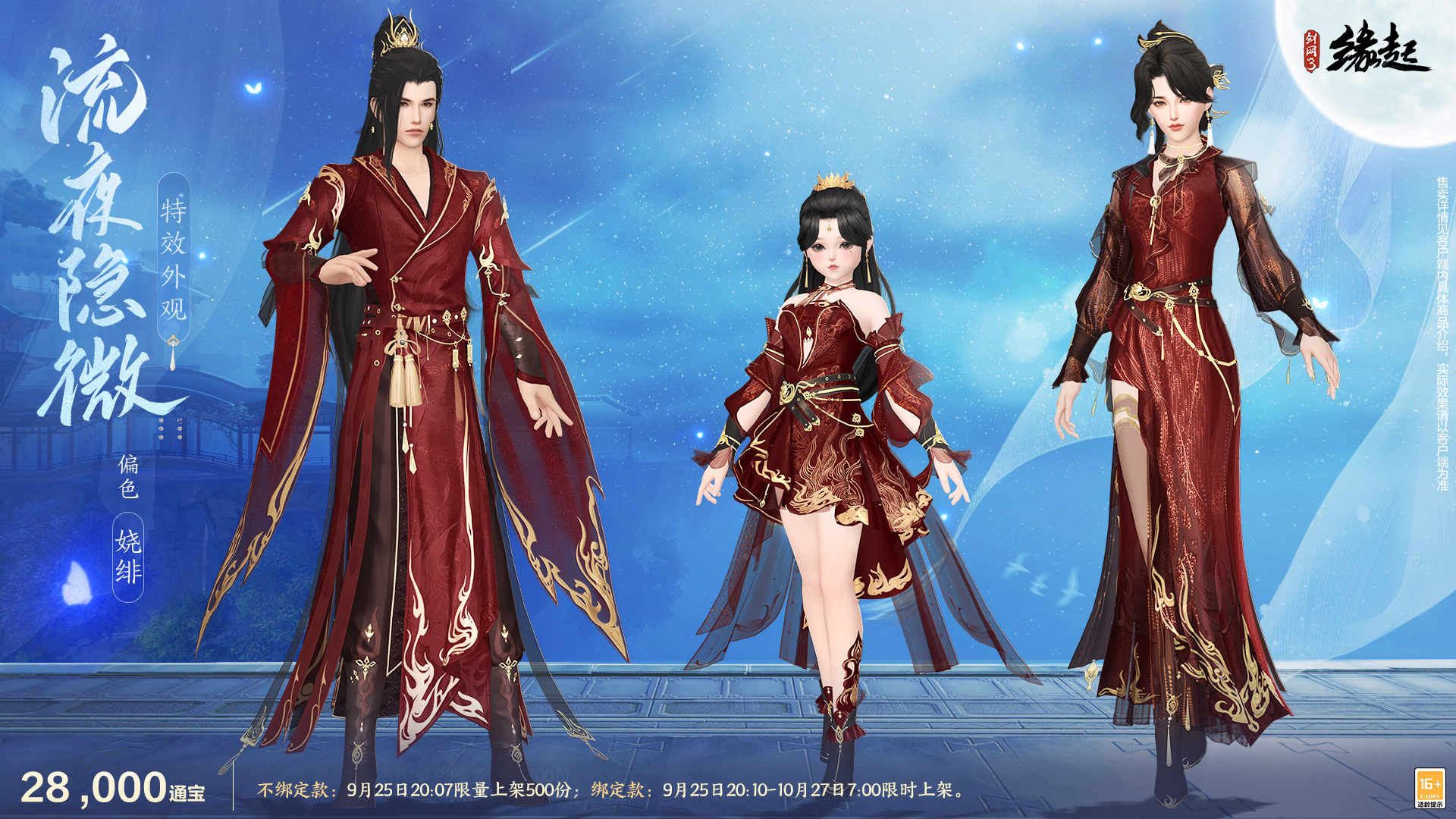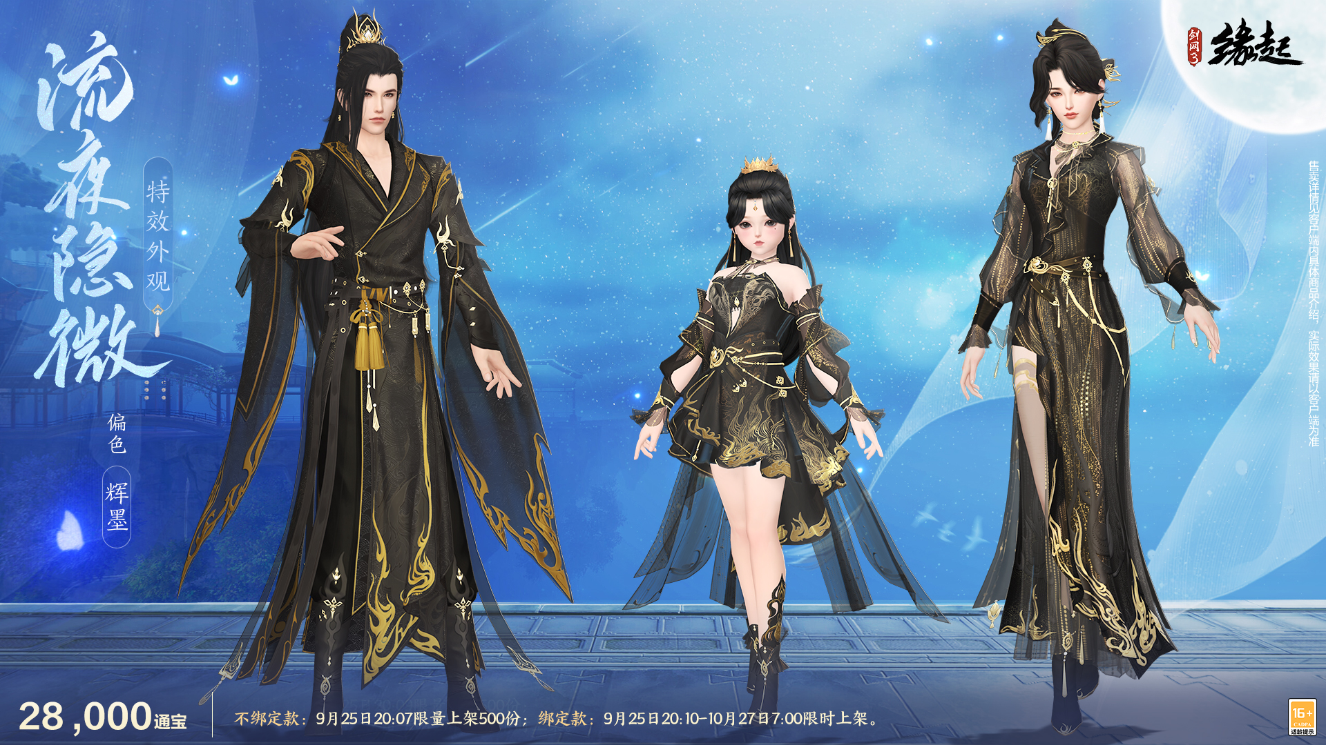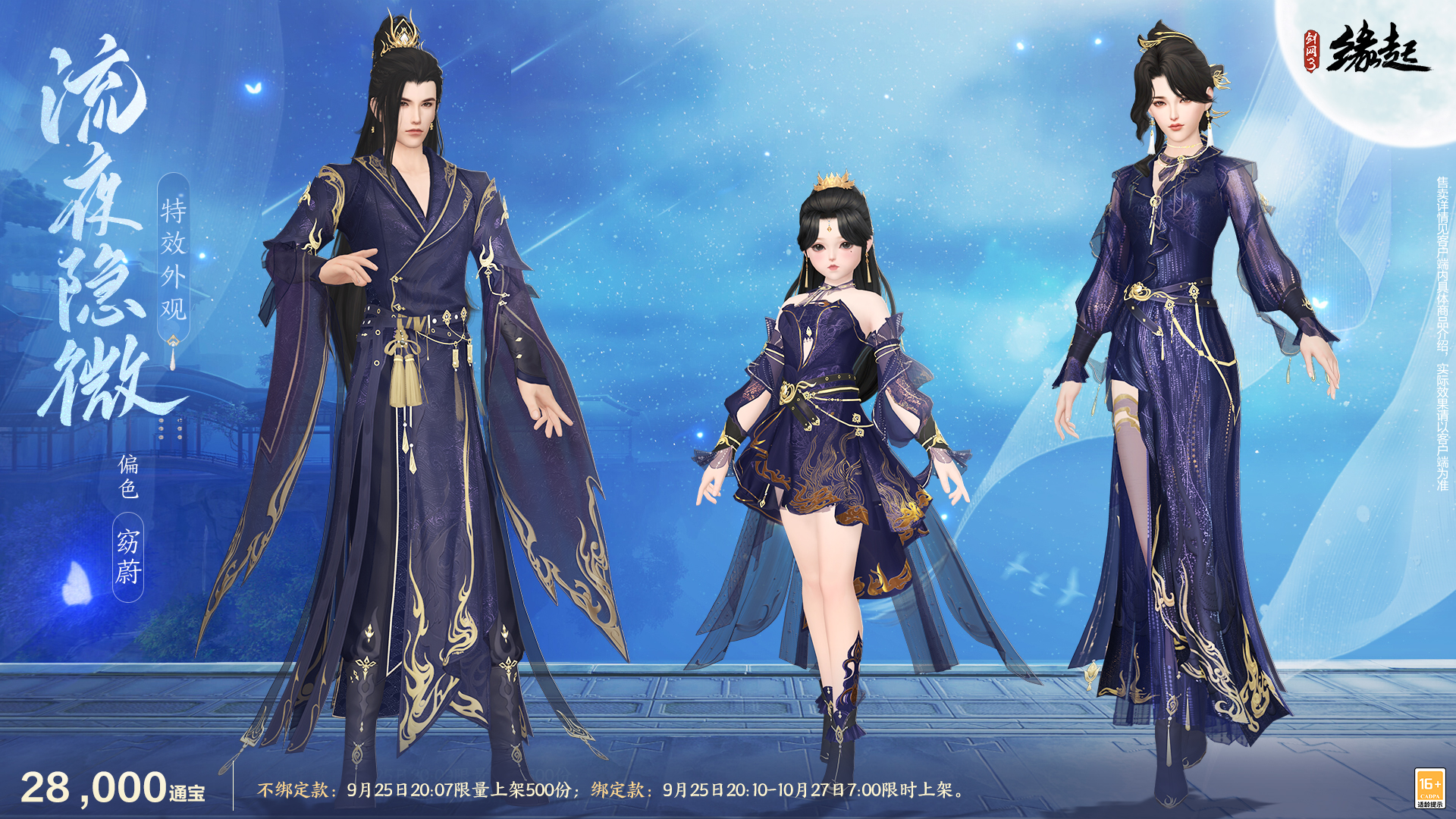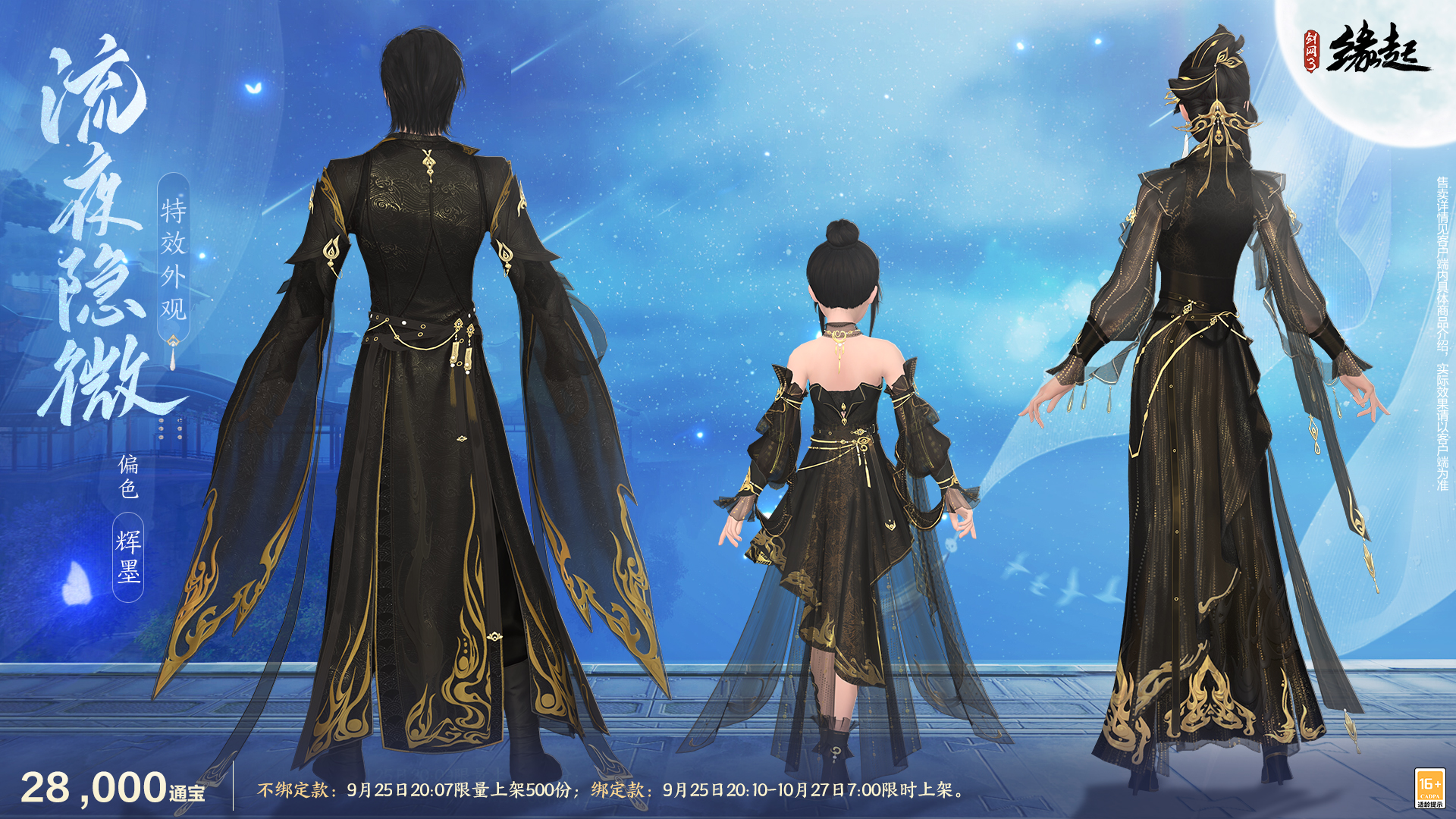 霓裳裁月缀星纹,剑影摇光夜未央。全新特效外观「流夜隐微」礼盒靓丽来袭。