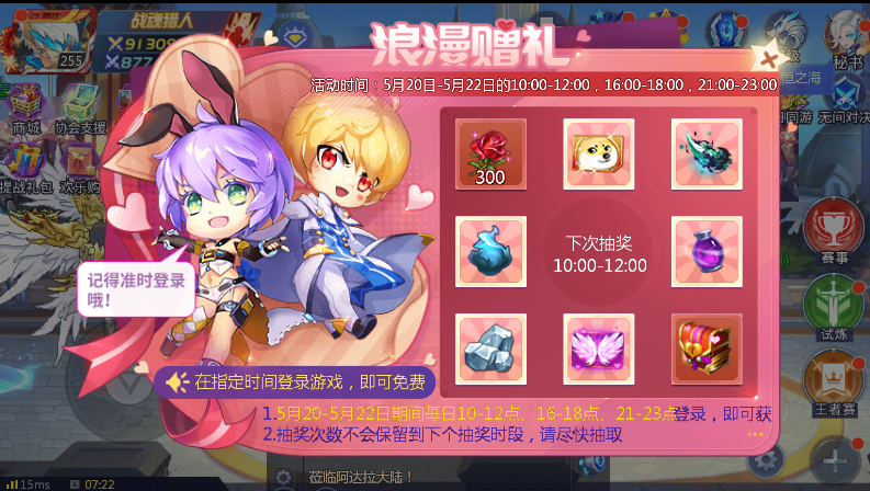 活动时间:5月20日至5月22日,每日10:00-12:00、16:00-18:00、21:00-23:00开启