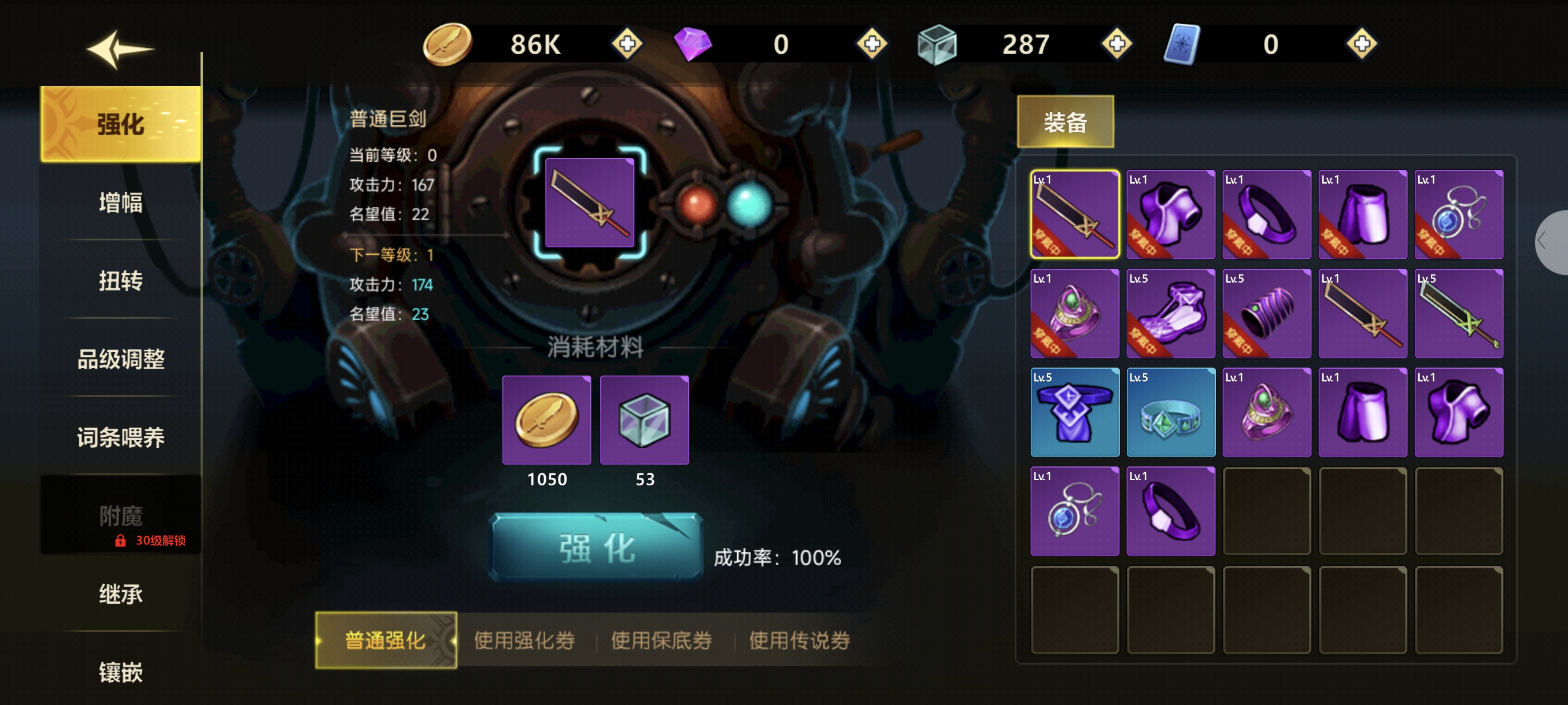 选择装备即可消耗金币及无色冰晶进行装备强化,也可以使用强化券进行100%强化!