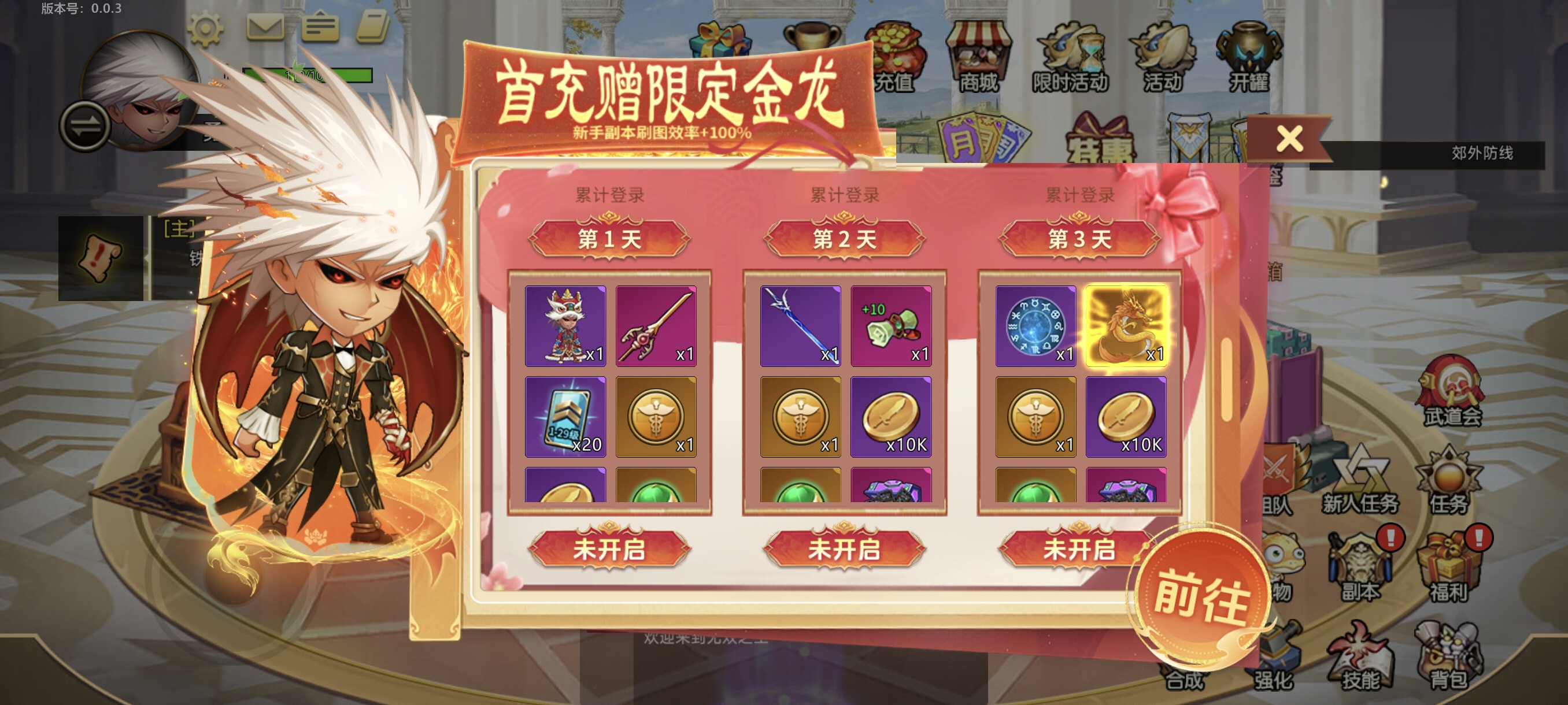 首充登录第三天即可领取史诗宠物【傲天金龙】,提升大量属性、获得宠物技能,还有稀有时装特效、稀有卡牌自选宝箱、复活币、强化保底券等丰厚奖励等你拿!