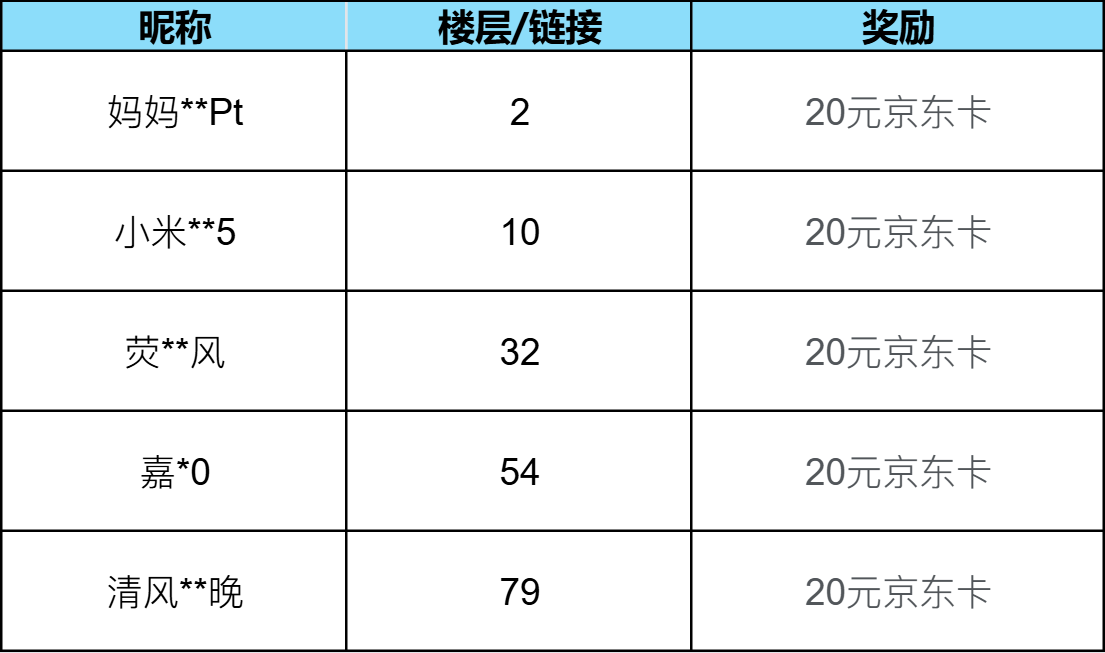 参与奖:在符合活动要求的参与者中,随机抽取5位,各奖励20元京东卡/人