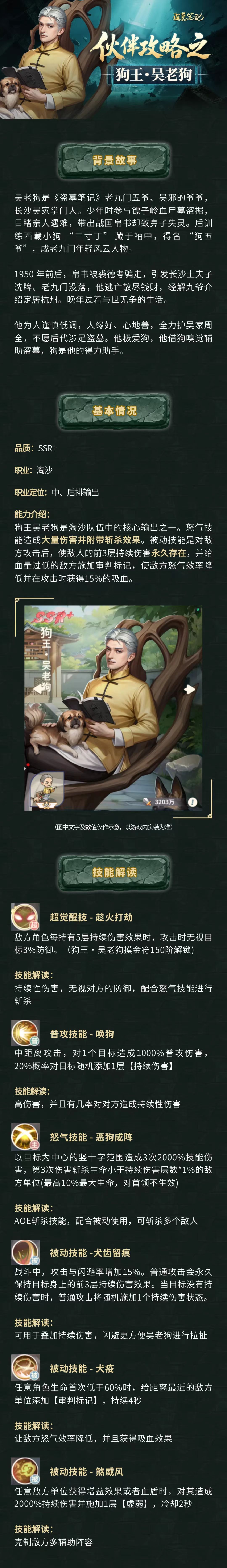 作为《盗墓笔记》中老九门的五爷,吴老狗在风雨飘摇的盗墓江湖中奠定了吴家的根基。本期角色档案,就给大家介绍一下吴老狗在游戏中的技能和搭配技巧吧!