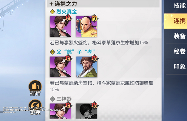 这里的连携需要根据上阵格斗家的信息进行合理搭配才能满足,比如草薙京的格斗连携,就需要让二阶堂红丸或大门五郎一起出战时才会触发。触发后会提升草薙京15%的伤害,同时若草薙京的这两个兄弟其中一人被击退时,还会让草薙京额外获得300怒气,更快速的释放自己的终极大招。