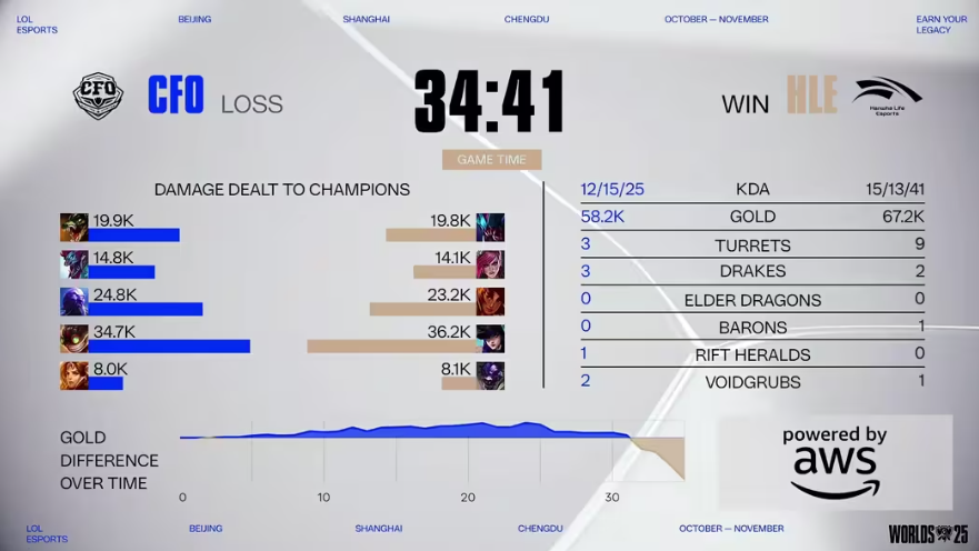 前期阶段,双方各有收获。CFO拿到了2条小龙和峡谷先锋,而HLE则推掉了上路一血塔,并且在经济上领先了2K。中期,HLE拿下了厄塔汗,CFO抢龙失败。23分钟时,CFO中路推进,击杀了Zeus的兰博,还在野区抓死了Peanut的皇子,拿下了听牌龙。然而,后期30分钟,HLE趁Doggo回城的时机,拿下了第一条大龙。在随后的混战中,HongQ的发条被秒,HLE打出了0换4的精彩团战,31分钟,HLE赢下了首局比赛,首局伤害最高的是Zeka的沙皇和HongQ的发条。