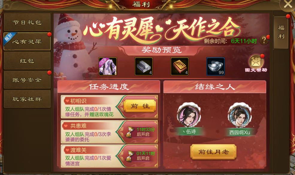 活动介绍:身无彩凤双飞翼,心有灵犀一点通!活动期间,玩家可与一名异性玩家组队相约造访月老,双方确认后即可绑定结缘关系,开启“心有灵犀”系列任务,相继完成初相识、共患难、渡难关任务后,即可获得专属情缘奖励,更有浪漫寄语等你解锁与分享!