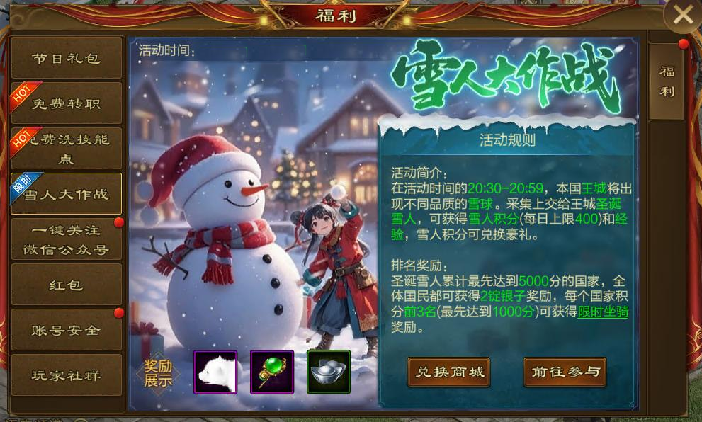 活动介绍:活动期间,各国王城可在地图上随机刷新5种不同品质的雪球,收集雪球上交至雪人处即有机会获得限时坐骑、经验、银子等惊喜奖励!
