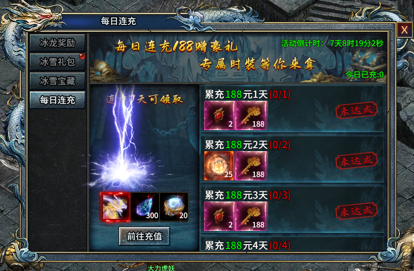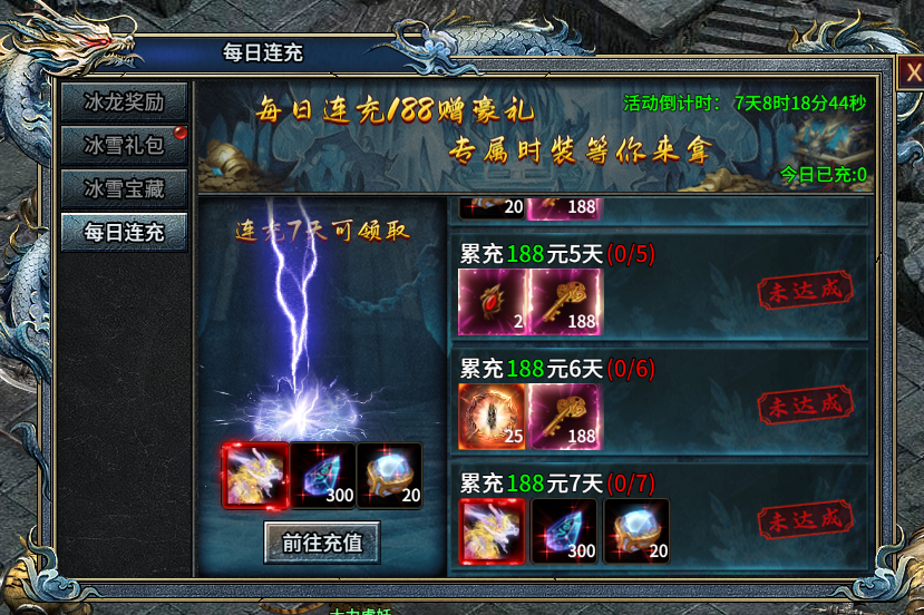 活动简介:史诗级连充活动开启!活动期间,游戏开放每日连充活动,每天充值188元,达到指定天数即可获得奖励,专属时装等你拿。