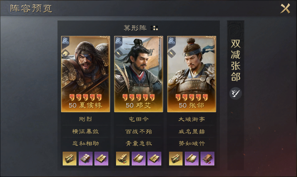 携带战法:夏侯惇横征暴敛+忘私相助,邓艾百战不殆+青囊急救,张郃威名显赫+势如破竹