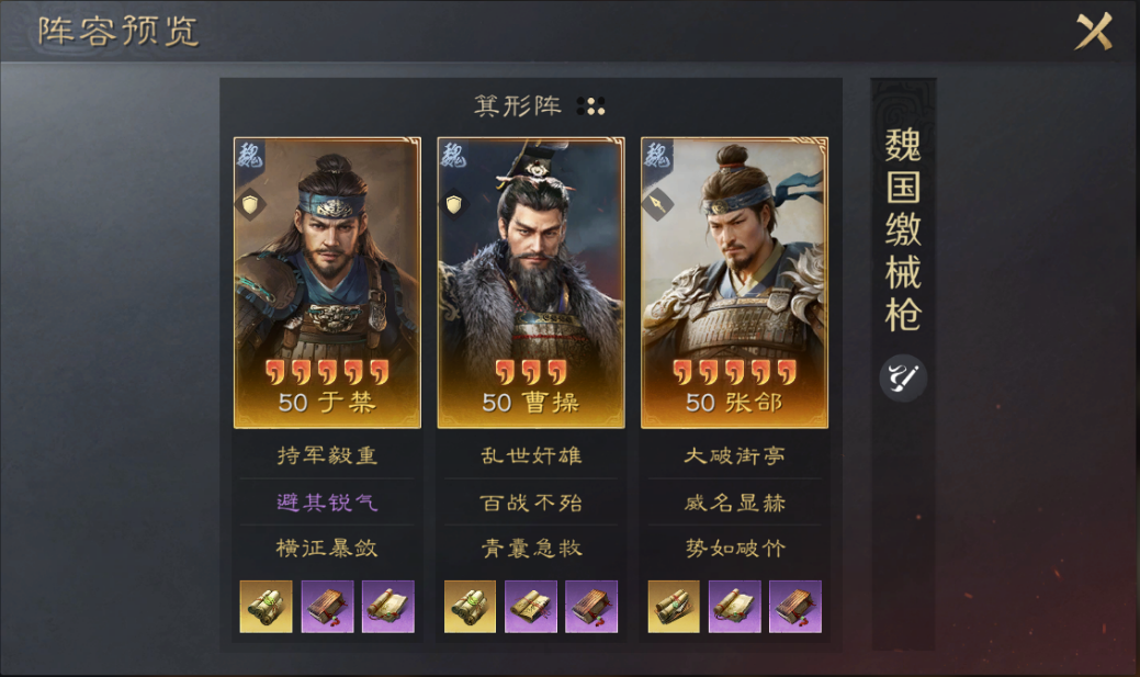 队伍解析:于禁横征暴敛能够保证自身坦度,避其锐气保障团队坦度,曹操自带战法能为队伍提供减伤和回复,百战不殆同时提升于禁统率、张郃武力、自身智力,青囊急救保障队伍血量健康,核心输出张郃带威名显赫提供回复及输出,势如破竹提供会心及输出。于禁、张郃再配合两本《互势》韬略,缴械效果非常多,能够有效克制反击队及追击队,如典韦、黄忠等队伍。