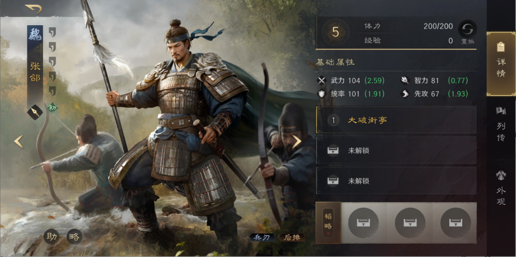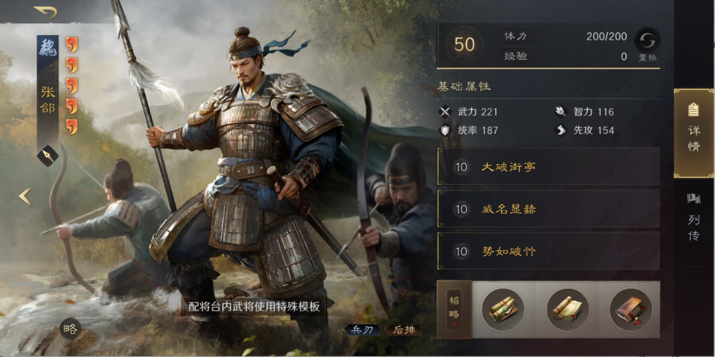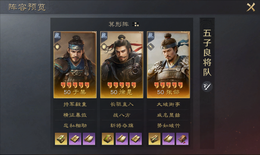 韬略细节:于禁《持军》《先勇》《敌勇》,徐晃《破军》《机动》《励心》,张郃《机变》《破敌》《王道》