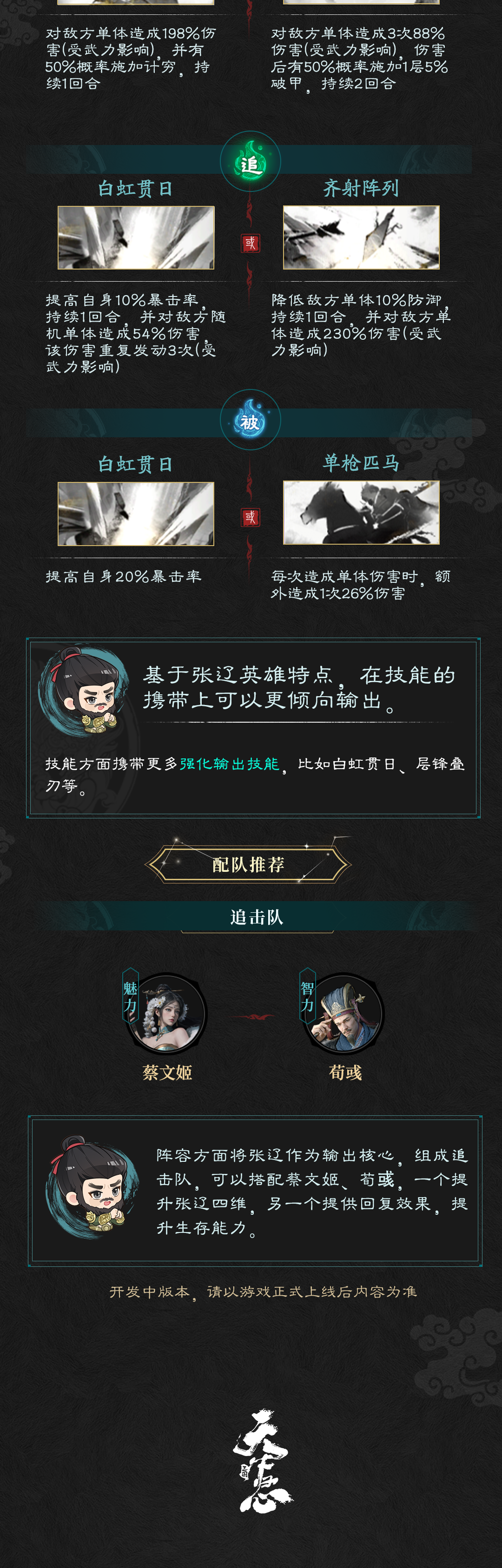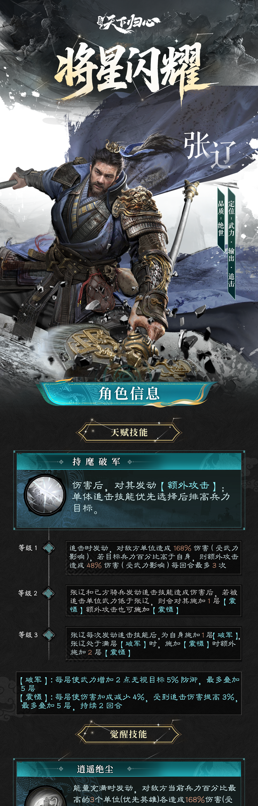 一生转徙,终遇明主,曹魏砥柱之将。勇贯三军,智慑敌胆。八百破十万,虎啸逍遥津。暮年“张辽不可当!”之威名不散。本期《将星闪耀》飞弟特呈文远之胆略——沉毅弘毅,威荡三军,鏖战八方,定助主公驰骋霸业!