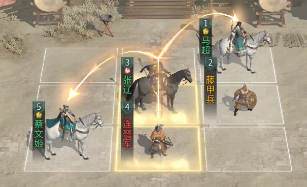 3、队伍站位:队伍站位如下,确保主C张辽能同时踩到蔡文姬与马超的追击格效果,从而最大化技能触发频率与队伍整体输出。