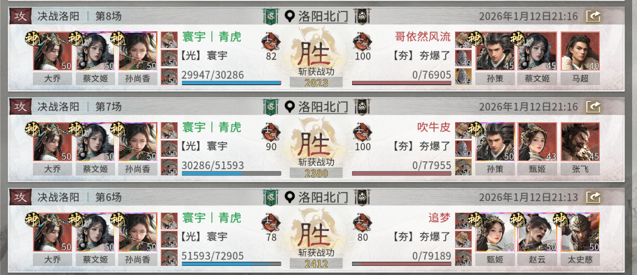 第一个变阵点:蔡文姬那个位置,可以换成孙策。孙策能直接给香香挂满3层弓意,启动飞快!但要注意,这么搭配就得和宝物【巾帼】说拜拜了,得换别的宝物,需更换为【破军】或【霸王】。