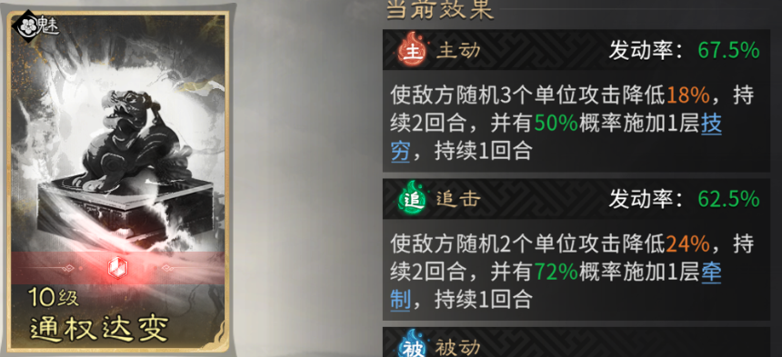 黄月英:主动技能固定携带【通权达变】,降低敌方攻击并有概率施加【技穷】(无法发动主动技能);