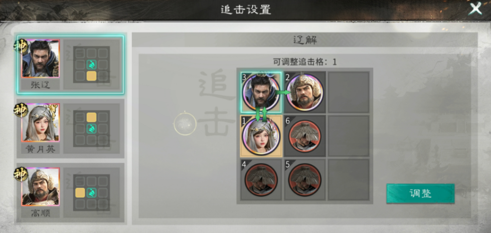 英雄站位:高顺不站追击格,张辽站高顺的追击格,并与黄月英互站追击格。