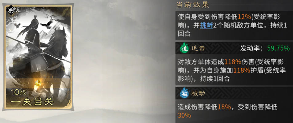 被动技能固定携带【一夫当关】提供30%的减伤能力,让整个阵容的坦度提升。