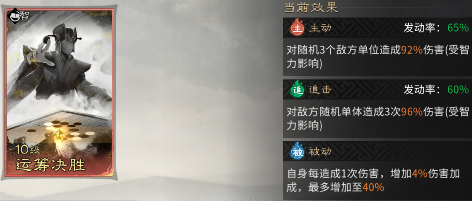 被动技能携带【运筹决胜】,每造成一次伤害获得伤害加成,很适合张辽有多次触发的性质,并且可以通过追击技能的决水破敌群体输出效果,快速叠满伤害加成,为张辽的输出提速。