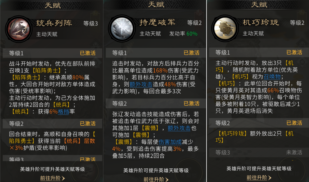 高顺的天赋技能【统兵列阵】,可在开局召唤陷阵勇士(继承高顺80%属性),并为全队附加两层【统兵】效果,每层提供6%格挡率,持续两回合,有效提升队伍坦度。