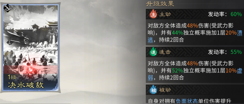 追击技能固定携带【决水破敌】,完美适配张辽的天赋,为对面全体挂上震慑和虚弱效果,进一步降低对面的伤害。