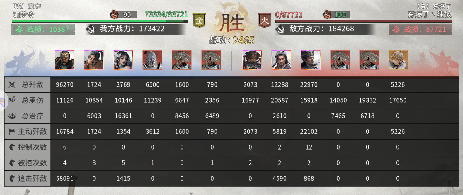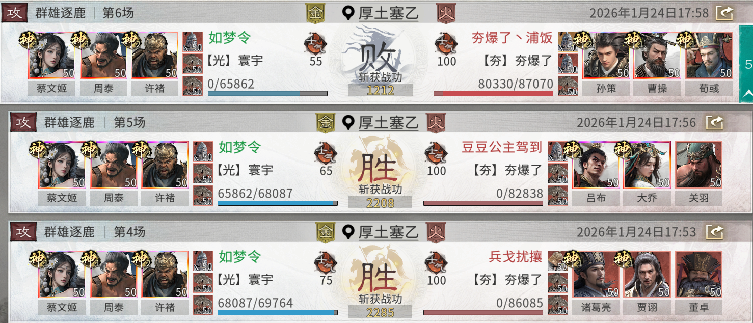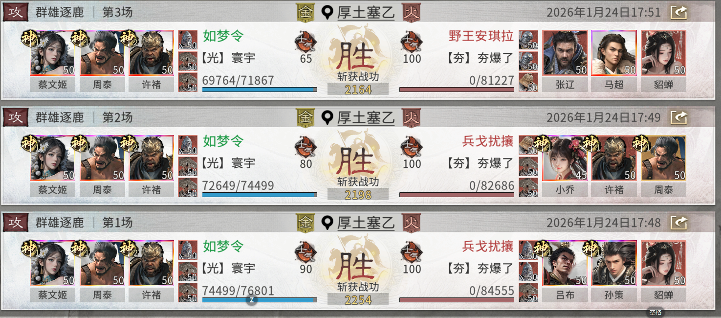根据实际战报显示,该阵容在面对以三觉醒英雄董卓、贾诩、诸葛亮为代表的控制型混乱队时,仍具备可观的胜率;而在对阵依赖单核输出的孙尚香队、吕布队时,更能凭借精准点杀取得优势。