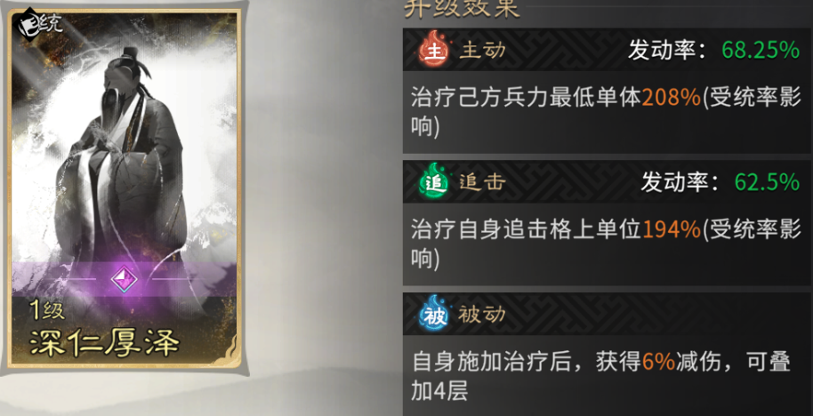 主动技能固定携带【深仁厚泽】,为己方提供持续治疗以增强团队生存能力;