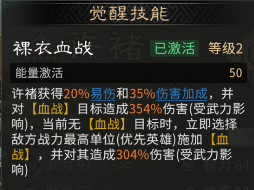 许褚的天赋【背水一决】,具备极强的单体爆发能力,在多数对局中都能发挥关键作用。