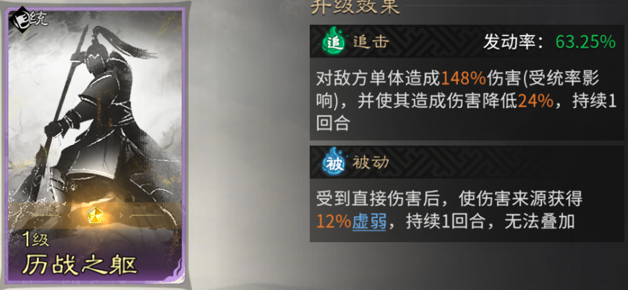 被动技能固定携带【历战之躯】,在受到攻击时,可为伤害来源附加持续一回合的虚弱效果,降低其后续输出。该配置兼顾了队伍续航与生存能力。