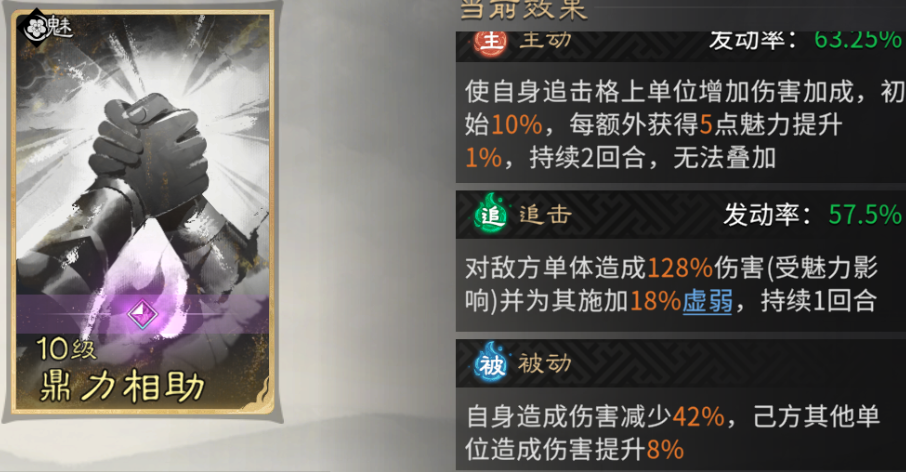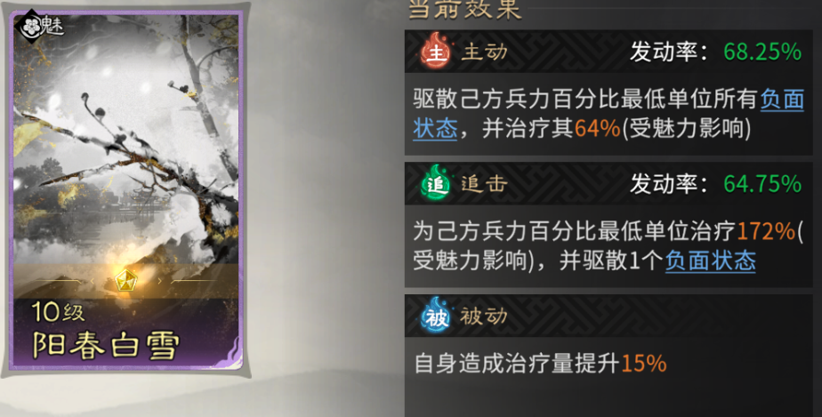追击技能固定携带【阳春白雪】,在行动时为己方兵力比例最低的单位恢复兵力,并移除一个负面状态,在辅助输出的同时兼顾团队续航与状态保护。