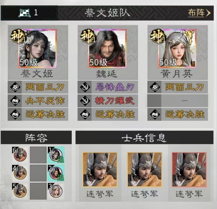 英雄站位:魏延有一个很重要的机制,即造成伤害不受自身兵力影响,意味着他可以站中间来吸收名将的伤害,并且魏延觉醒还能给自己施加护盾,肉盾加主c,存在感拉满了,三位英雄都放置在前排,魏延站黄月英与蔡文姬的追击格,蔡文姬站魏延的追击格。