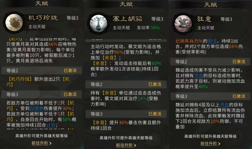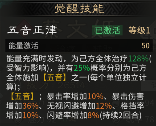 蔡文姬的天赋【塞上胡笳】,赋予追击格单位【余音】增益,使其有概率额外发动一次追击且增加爆伤,配合觉醒技【五音正津】,随机增加爆伤以及暴击和无视防御的增益buff,让魏延以及全队的伤害更上一层楼。