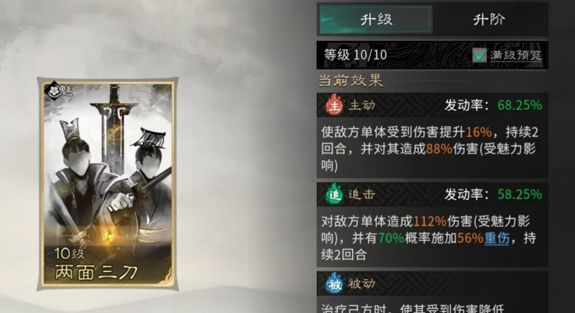技能配置:蔡文姬和黄月英主动都带【两面三刀】,该技能可以使敌方单体受到伤害提升,并且可以叠加。
