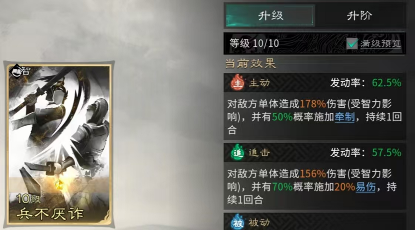 蔡文姬的追击技能推荐携带一个【兵不厌诈】,增加易伤效果。