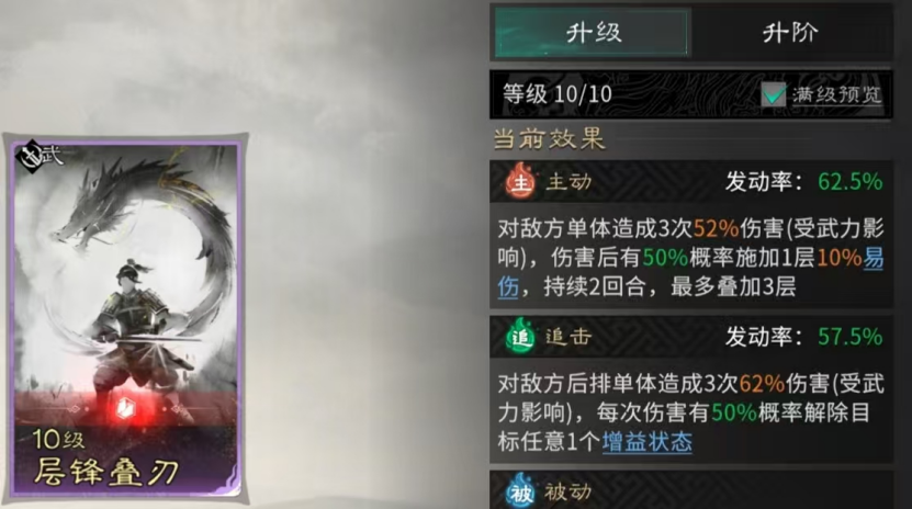 魏延是选择主动带【层锋叠刃】,该技能可以造成3段伤害并且都有几率触发易伤,且可以与蔡文姬携带的主动技能【两面三刀】和追击技能【兵不厌诈】的易伤叠加;