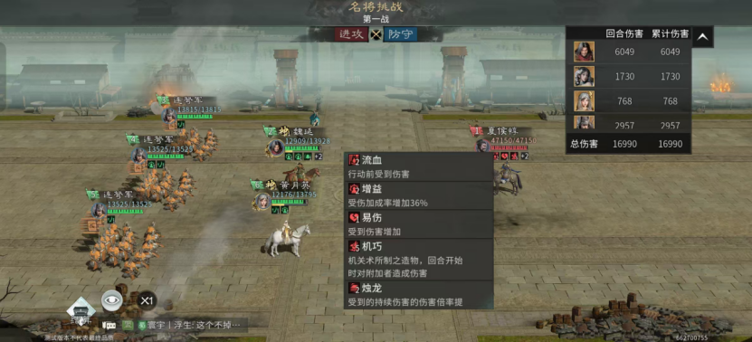 下面图片示意中可以详细看到敌方名将被施加的debuff以及持续伤害,多种debuff叠加以及自身增益buff叠加之下,名将所受伤害呈指数级上涨。