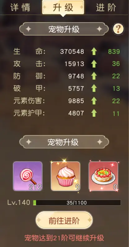 升级和进阶需要消耗的道具如上,进阶和升级都可以提升具体宠物的属性,但是宠物的等级上限是根据阶级来定的。另外,当宠物进阶到一定阶段可以解锁强力被动技能,被动技能可通过使用宠物技能书进行升级。宠物的升级素材可以通过商店和运营活动获得。而进阶丹则通过宠物副本和商店来购买