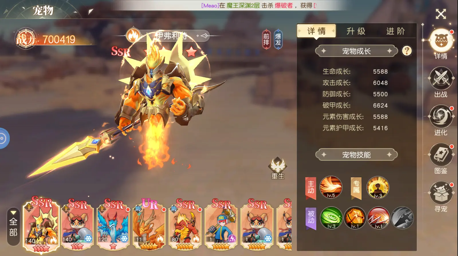 详情面板,可了解到该宠物的技能组和成长属性。并对该宠物进行升级和进阶。