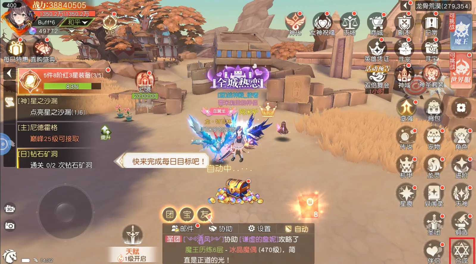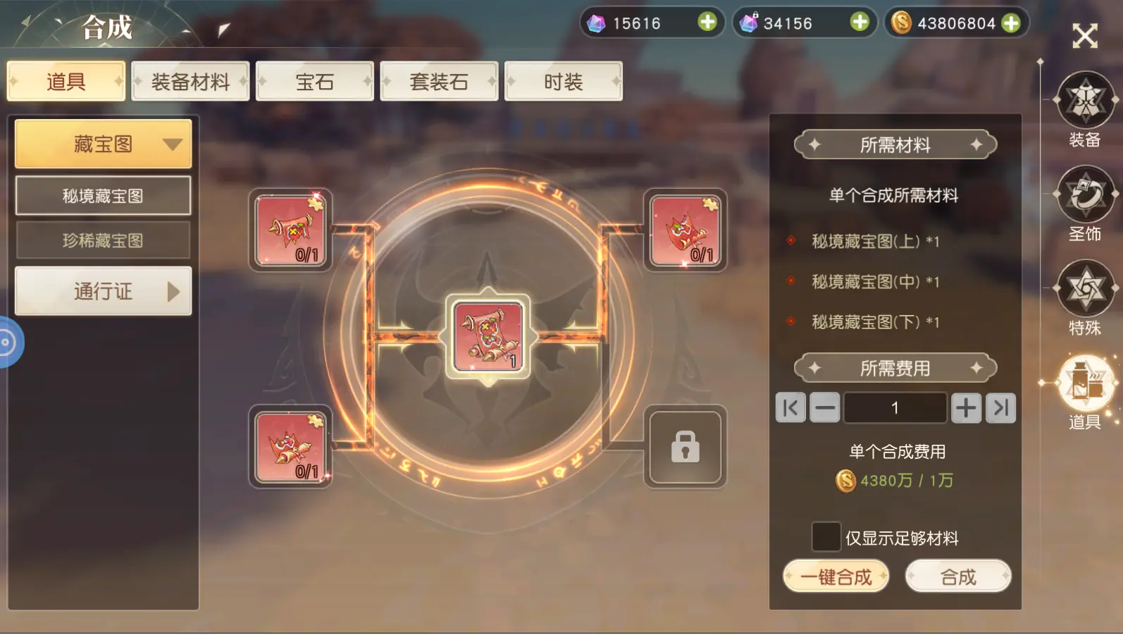 道具:可将日常道具合成为高级的日常道具,包括藏宝图合成、装备材料合成、宝石合成、套装石合成和时装合成。以上合成在上文有罗列。