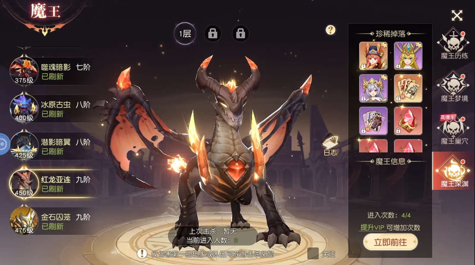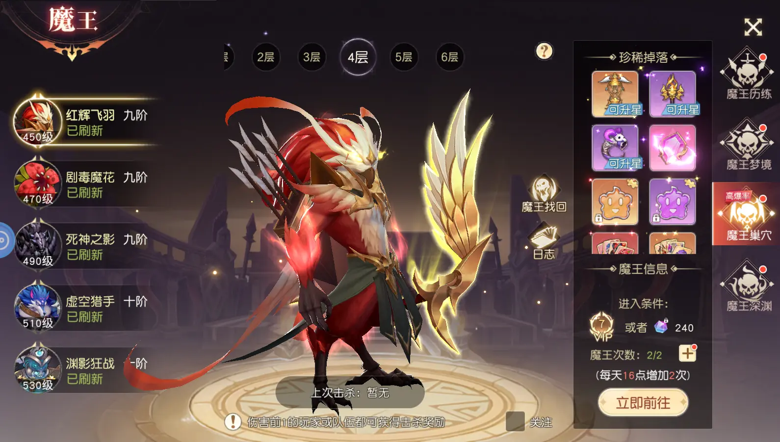 等级越高的魔王,掉落奖励越好。这是获得天神碎片的好途径