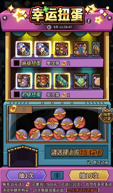 2)幸运扭蛋有两个活动奖池:初级扭蛋、高级扭蛋,奖池需要消耗的扭蛋券数量不同