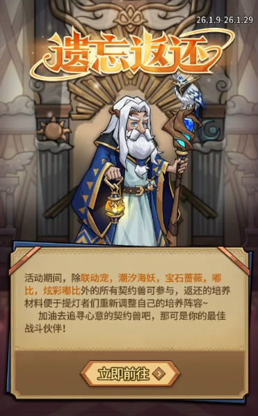 「活动介绍」活动期间,除联动宠,潮汐海妖,宝石蔷薇,嘟比,炫彩嘟比外的所有契约兽可参与,返还的培养材料便于提灯者们重新调整自己的培养阵容