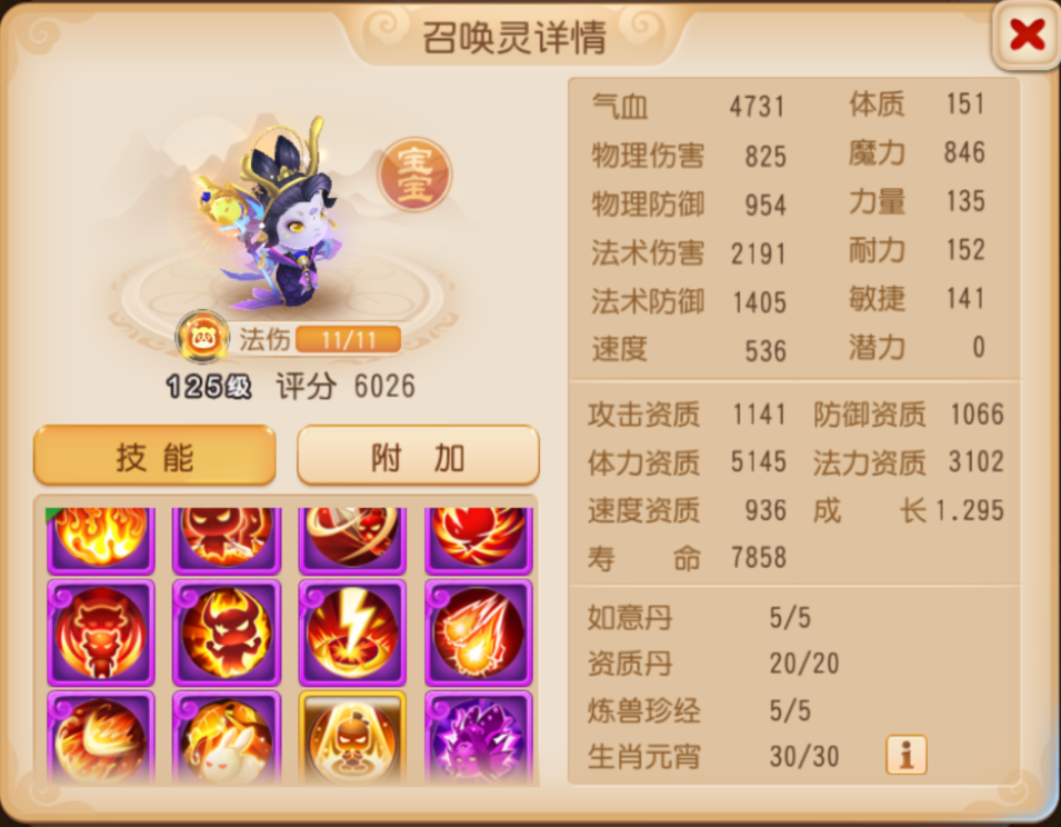这只玄英夫人有着高达1.295的成长,外加3100的超高法力资质,输出能力可谓毁天灭地!如若替换召唤,更是能触发“遗志”临时提高自身面板*15%的法术伤害,再搭配“法术追击”造成击败再度施放群体法术的效果,三杀、四杀乃至五杀统统不在话下!