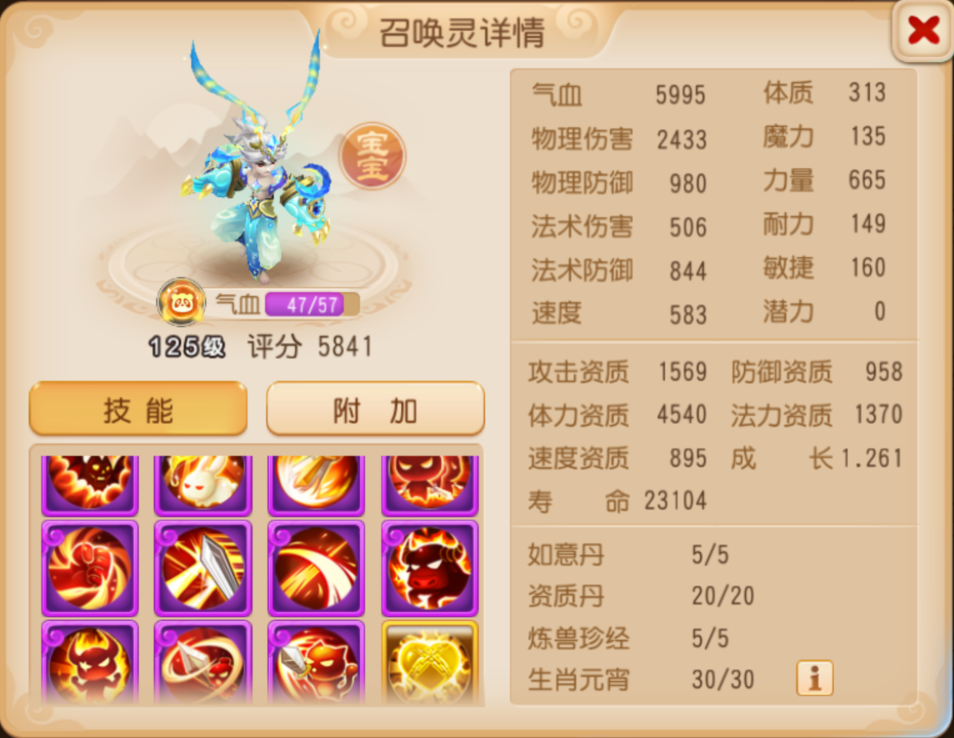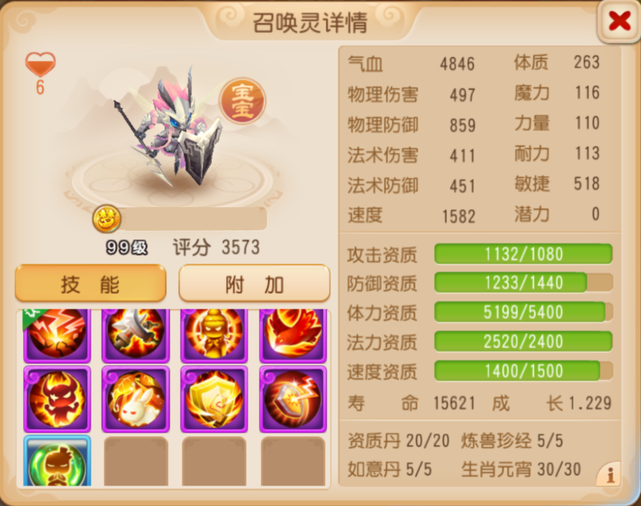 启明星作为百宠仙池限定召唤灵,能够合出满技能是相当不容易的,更令人震惊的是在全红书的情况下还成功保留了“遗志”这一招牌特殊技能。在“遗志”高额的面板法伤加成和超多的输出兽诀的给力加持下面伤能力依旧不俗,当这只启明星召唤出场之际,就是我方吹响进攻号角之时!