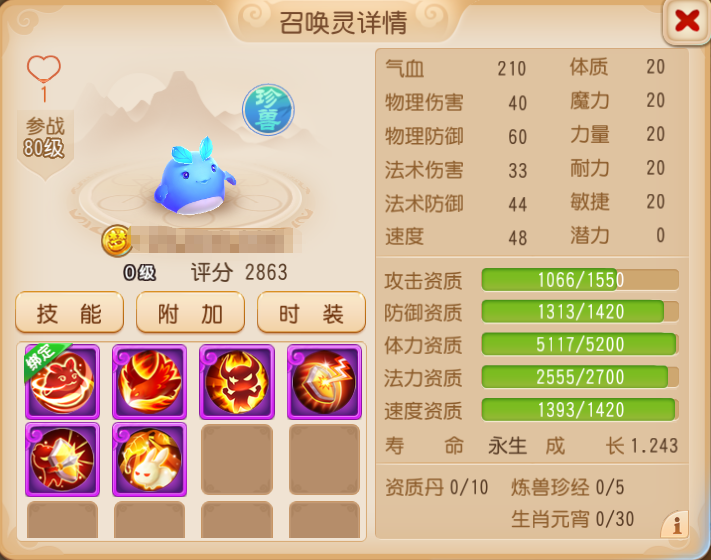 6个格子中有3个是特殊技能!这只宝宝除自身的“咕噜咕噜”有几率不受法术伤害结果外,“法术防御”及“嘲讽”两个可以同时生效的能力让其成为物法双抗的超级城墙,“高级神佑复生”“高级强壮”“高级敏捷”三本配速必要技能一本不漏,这只坦度超高的双特咕噜咕噜能否让各位少侠眼前一亮呢?