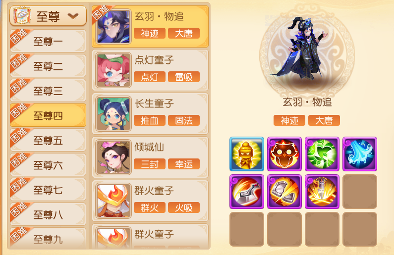 至尊四主怪玄羽为大唐官府,血量较高时会使用“横扫千军”技能,如果携带“杀气诀”效果,一回合能轻松击飞三只召唤灵,但本关没有怪物携带“驱鬼”技能,因此推荐少侠使用“嘲讽”召唤灵吸收伤害。同至尊三一样,如果在第5回合前主力召唤灵被击飞过多,推荐重新挑战。