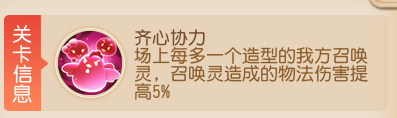 关卡特性:场上每多一个造型的我方召唤灵,召唤灵造成的物法伤害提高5%。